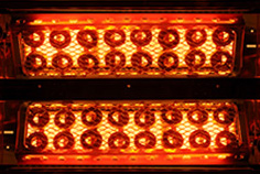 ヘルシーロースターは火の元(熱源)に油が落ちないようにガスバーナーを両サイドに配置し、ガスバーナーと焼きアミの角度を調節することで煙を出さない焼き方を実現しました。